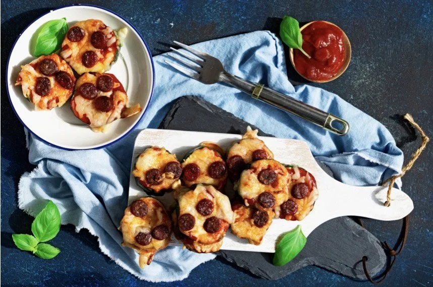 The perfect one bite appetizer to get ready for game day! Pro tip: Before assembling your mini pizzas, crisp the zucchini in an air fryer or in the oven for a more satisfying crunch!